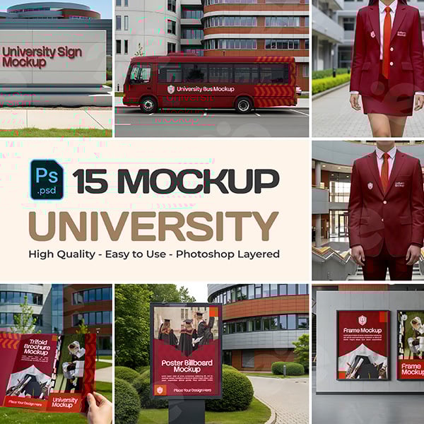 University Branding Mockup Bundle – 15 PSD Templates for Campus Signage, Uniforms, Posters & Bus Advertising
