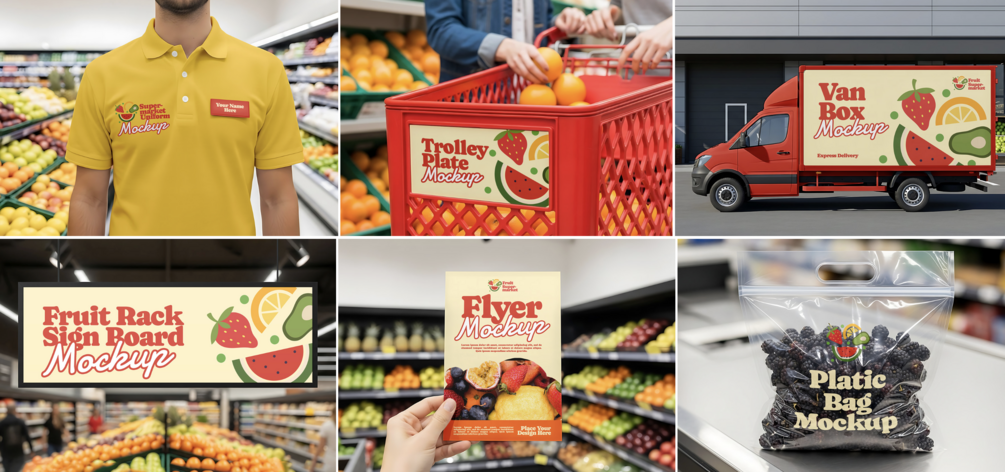 Perfect for farmers markets, juice brands, supermarkets, and food designers this all in one mockup bundle helps you visualize your fruit market identity like a pro!