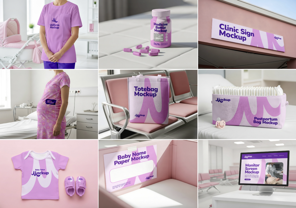 Create a caring and professional look for your clinic! This 15 in 1 mockup set includes uniforms, stationery, digital screens, packaging, and baby apparel perfect for obstetrics and maternity branding